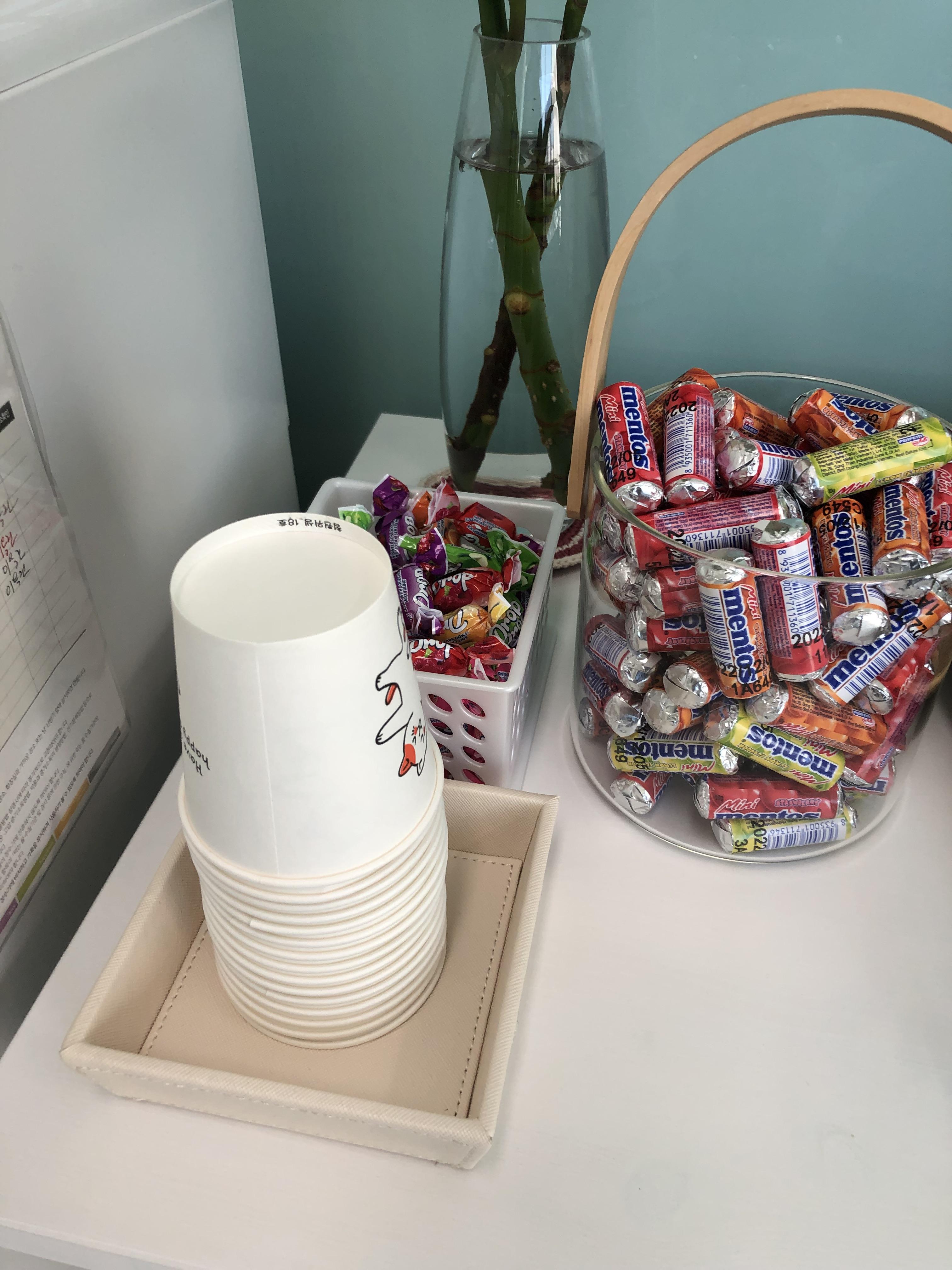 간단히 물만 마실 수 있게 종이컵과 당이 당길 때 드시라고 멘토스와 드랍캔디