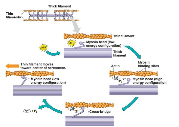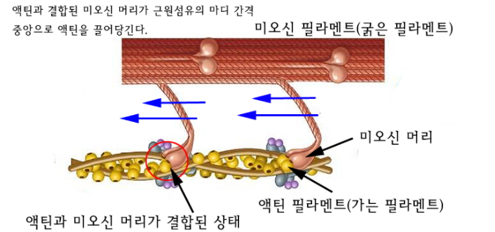 마이오신 헤드가 붙으면서 액틴 필라멘트를 잡아당기는데